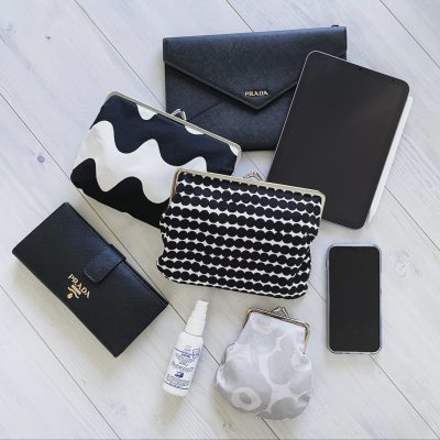 This is stuff in my bag for these days. I love Prada and purse with a steel clasp on top of it. It’s pretty and it opens up wide so it’s easy to get stuff out from it.